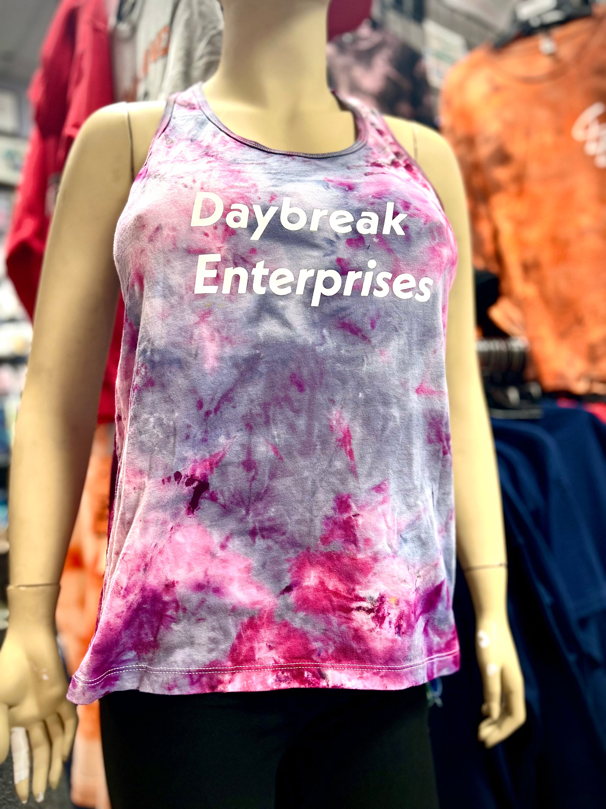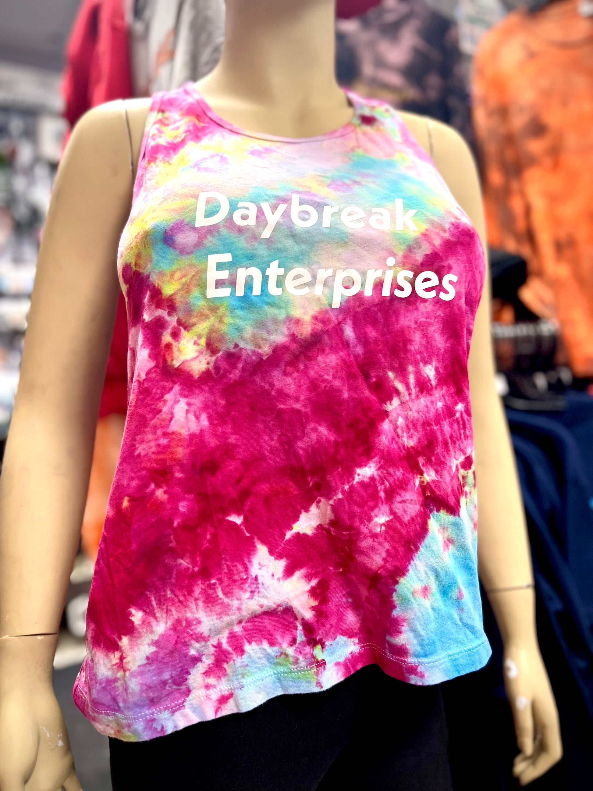 Woman's Daybreak Logo Racerback Tie Dye Tank Tops. Multiple colors to chose from.