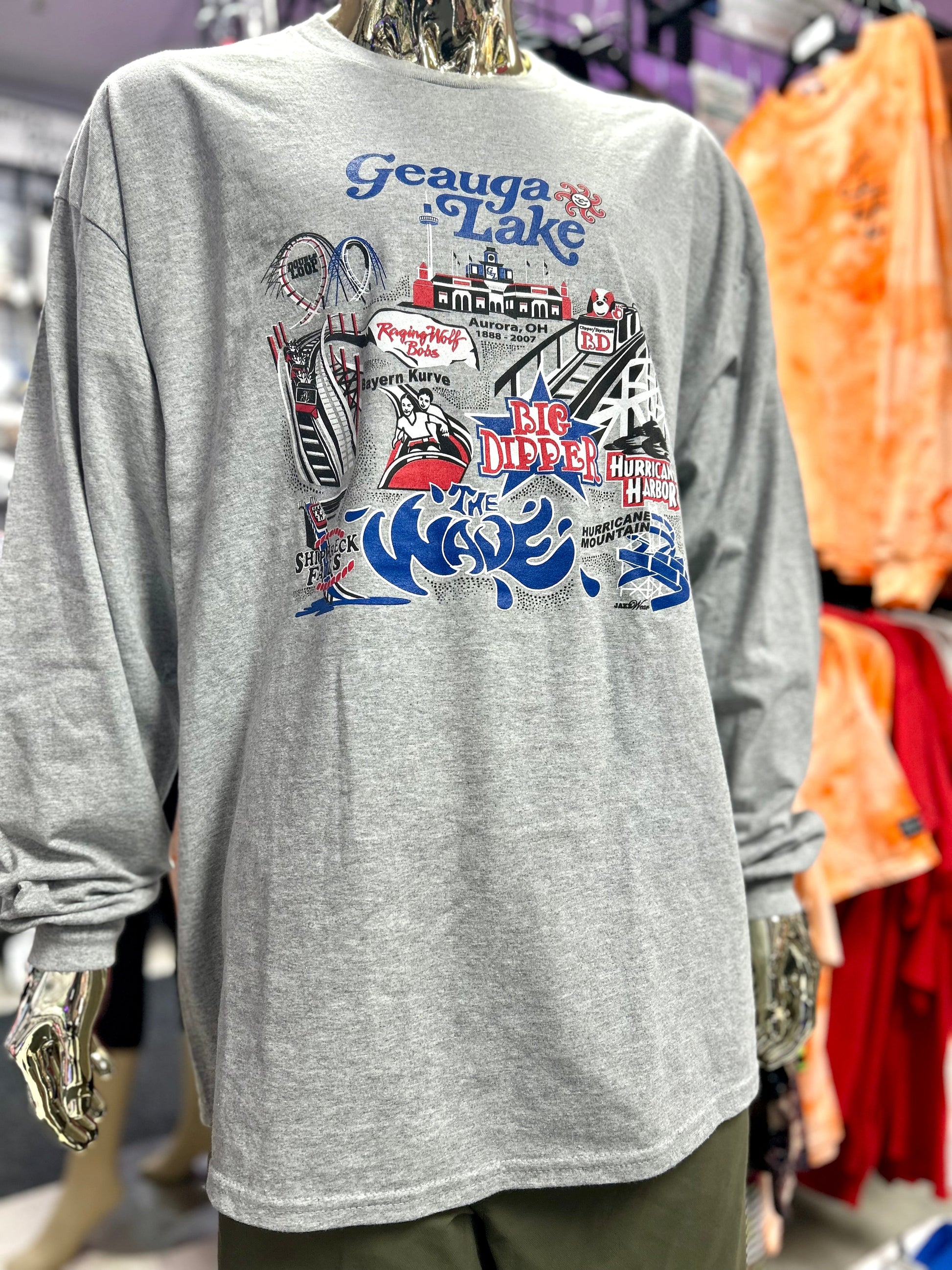 Wear a piece of Cleveland history with this Geauga Lake Park gray t-shirt, long sleeve t-shirts, and crew neck sweatshirts. Featuring iconic rides and attractions, it's a tribute to the beloved amusement park. Remember the legendary Big Dipper, gone but not forgotten. Though the park closed in 2007, its memories live on.
