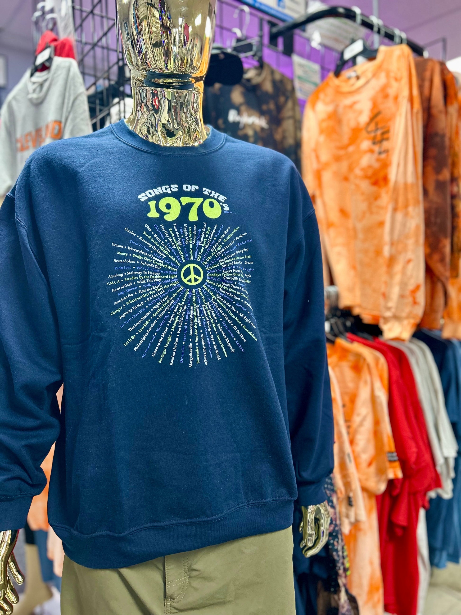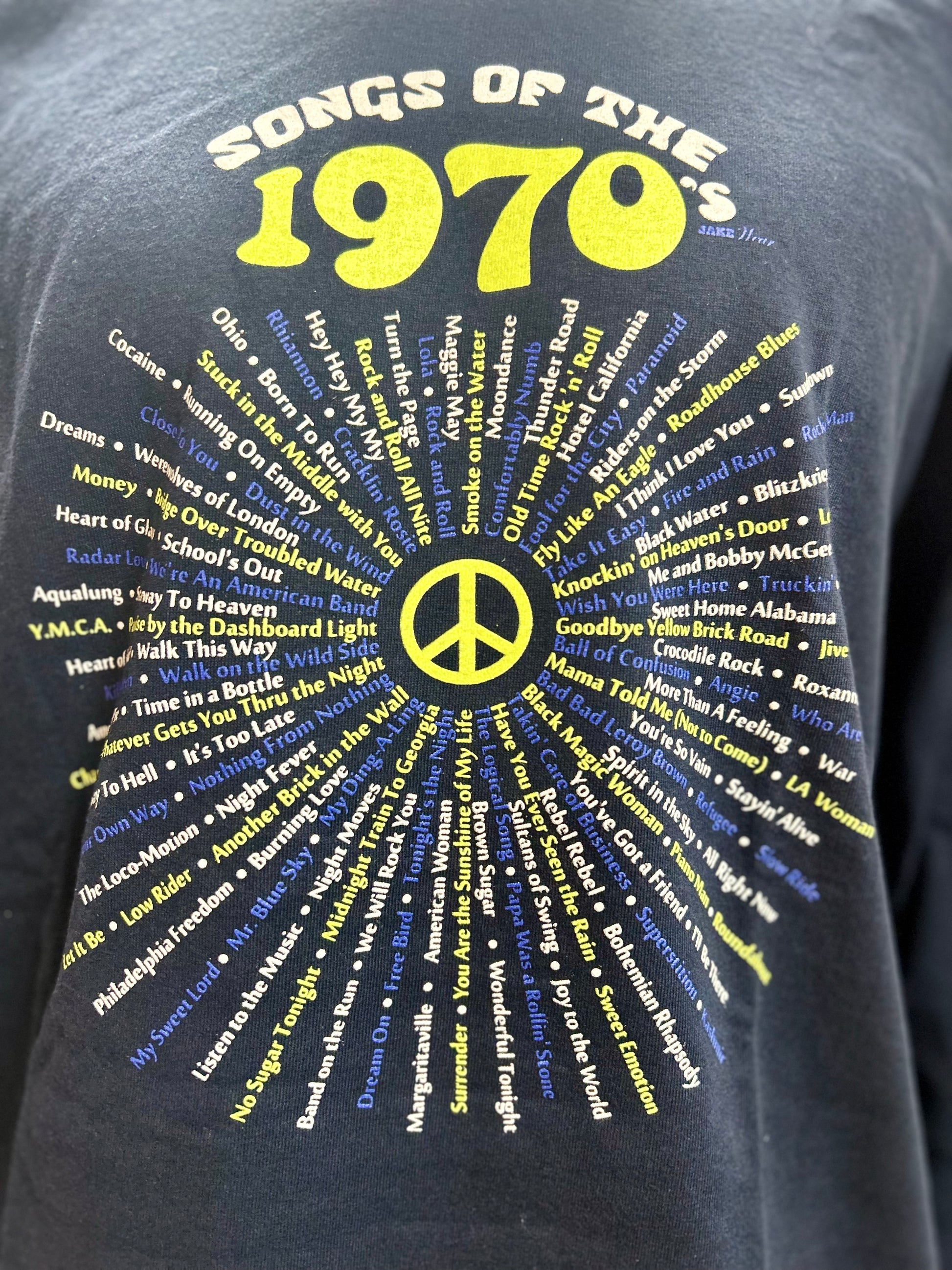Take a trip down memory lane with this "Songs of the 70's" black t-shirt. Relive the iconic hits that defined a generation, a time of change and history in the making. These chart-topping classics are still sung today! Get ready for your friends to ask, "Where did you get that shirt?"—and maybe even break into song!